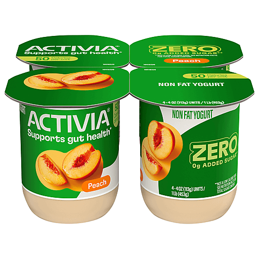 Start your day with your gut health in mind with Activia ZERO 0g Added Sugar* Peach Probiotic Nonfat Yogurt. Backed by 20 years of gut health research, this delicious peach yogurt contains billions of probiotics and 0 grams of added sugar.* Probiotics are living microorganisms that provide specific health benefits, including supporting gut health.*** Each peach yogurt cup has 0 grams of fat, and 50 calories per serving. Enjoy these 0g added sugar* yogurt cups as part of your breakfast, grab and go snacks, or as an addition to your yogurt smoothie. ***Enjoying Activia twice a day for two weeks as part of a balanced diet and healthy lifestyle may help reduce the frequency of minor digestive discomfort, which includes gas, bloating, rumbling, and abdominal discomfort.