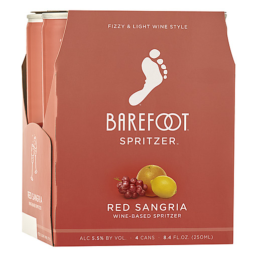 Barefoot Red Sangria Wine Spritzer delivers notes of berry, orange, lemon and lime all in the convenience of a can. With fruity aromas and a lingering citrus finish, the fizzy red wine-based spritzer is refreshing and sweet. This pack includes four cans of fruity Red Sangria. These single serve, perfectly portable wine cans are ideal for serving at a pool party, summer picnic or anywhere outdoors. Serve this light bodied Sangria wine spritzer chilled straight from the can, or pour it over ice. The sweet red wine spritzers come from Barefoot, the most awarded wine brand in US competitions. Let's get Barefoot.