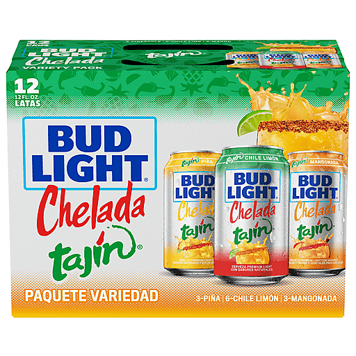 Bud Light Chelada Tajin Beer Variety Pack. Bud Light Chelada Tajín Chile Limón brings together the spicy chile, zesty lime and salt flavors of Tajín with the refreshing taste of Bud Light. Bud Light Chelada Tajín Piña is a premium light lager with sweet natural pineapple flavors, and the mild chili pepper, lime and salt flavors of Tajín. The non-tomato base blends refreshing Bud Light with the sweetness of pineapple and the lime, salt and mild chili pepper flavors of Tajín. Bud Light Chelada Tajín Mangonada is a premium light lager with natural mango flavors, chamoy flavors, and the mild chili pepper, lime and salt flavors of Tajín. This first to market Mangonada (non-tomato base) blends the sweetness of mango and chamoy mixed with Bud Light and the lime, salt and mild chili pepper flavors of Tajín.